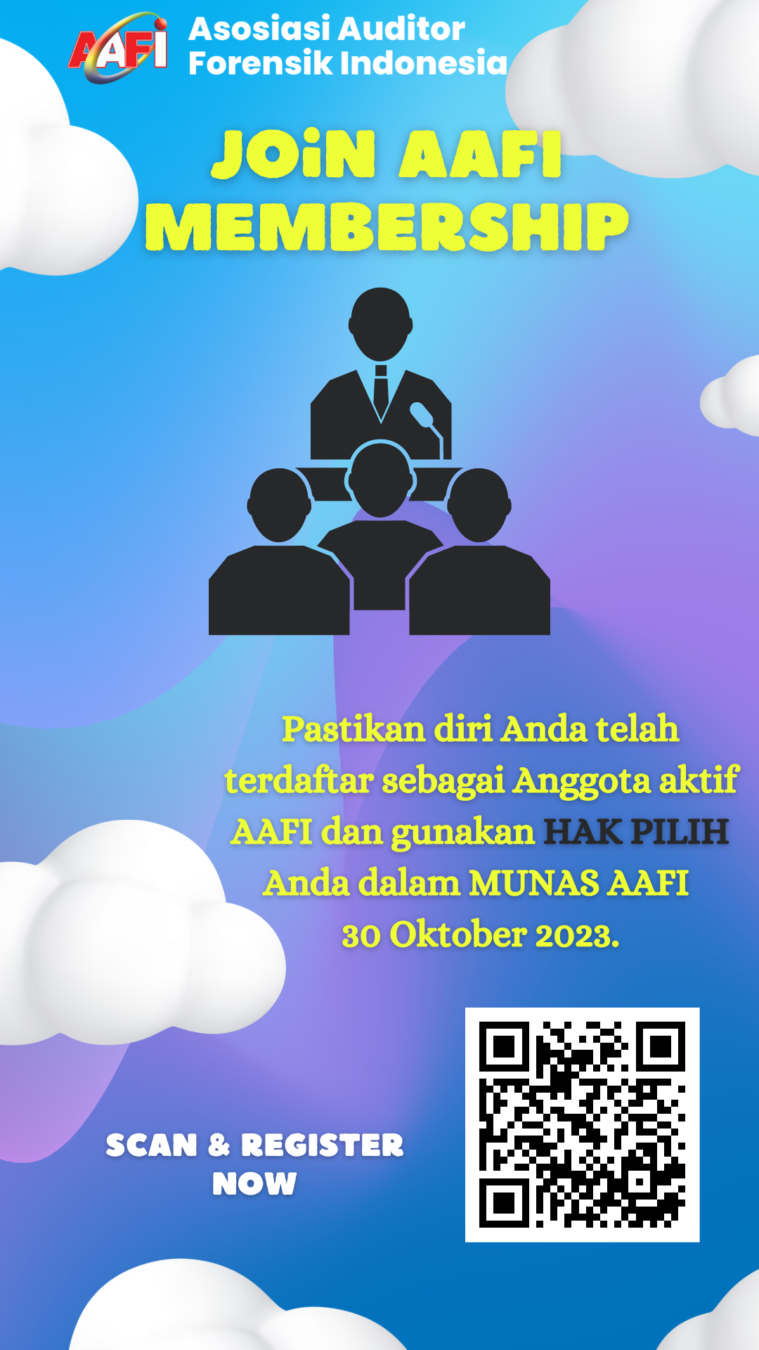 Asosiasi Forensik Auditor Indonesia (AAFI UMAR) mengundang Bapak/Ibu Anggota Aktif AAFI UMAR untuk melakukan pendaftaran Musyawarah Nasional (MUNAS) AAFI UMAR yang direncanakan akan dilaksanakan pada 30 Oktober 2023. Silakan melakukan pendaftaran di website AAFI UMAR dengan alamat www.aafiumar.org/2023. Jangan lupa siapkan Sertifikat Certified Forensic Auditor (CFrA) dan Bukti Iuran Tahunan AAFI UMAR saat pendaftaran.